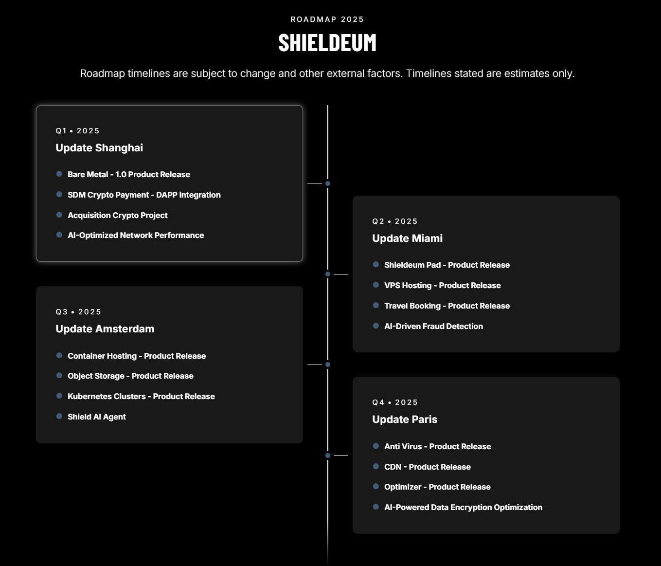 ____________________________________________________________________________________________ At Shieldeum, we are committed to delivering continuous innovation to drive the future of Web3 and decentralized infrastructure. Our 2025 roadmap outlines the key milestones, products, and updates we plan to release throughout the year. Please note that the timelines outlined are estimates and subject to change due to external factors.